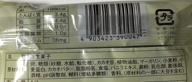 卵、糖類(砂糖、水飴、転化糖)、カカオ豆、植物油脂、マーガリン、小麦粉、小麦蛋白、カカオバター、脱脂粉乳、食塩、バニラエキス、澱粉、乳化剤、膨張剤、酒精、pH調整剤、糊料(増粘多糖類)、香料、(原材料の一部に大豆を含む)